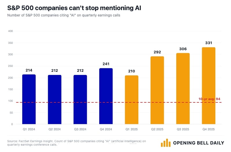 Two in three S&P 500 companies cited AI on their most recent earnings calls, more than triple the average rate of the last decade, according to FactSet.