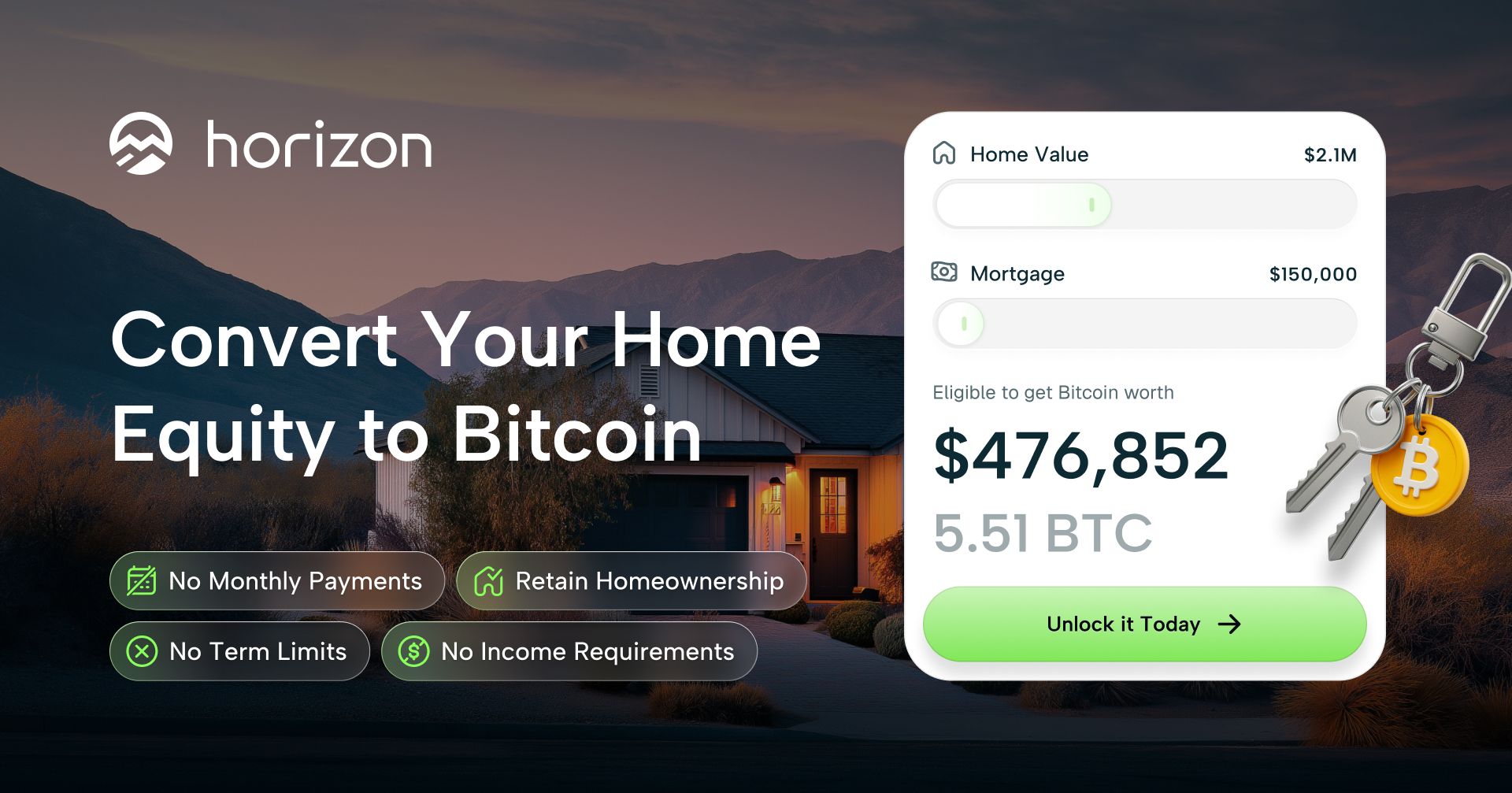 Horizon allows homeowners to convert home equity to bitcoin, so they can reallocate their capital out of their largest asset and into one they believe in.