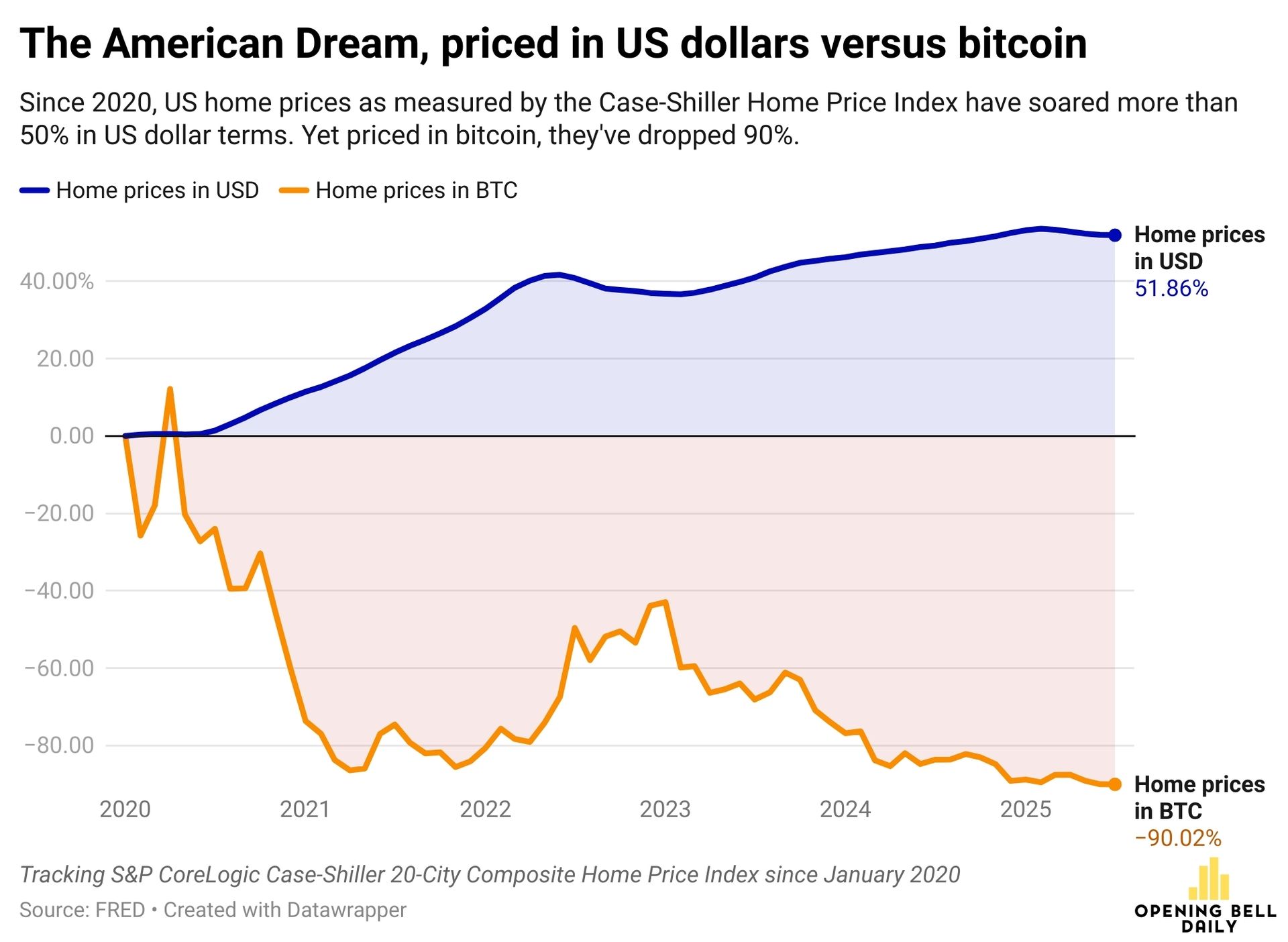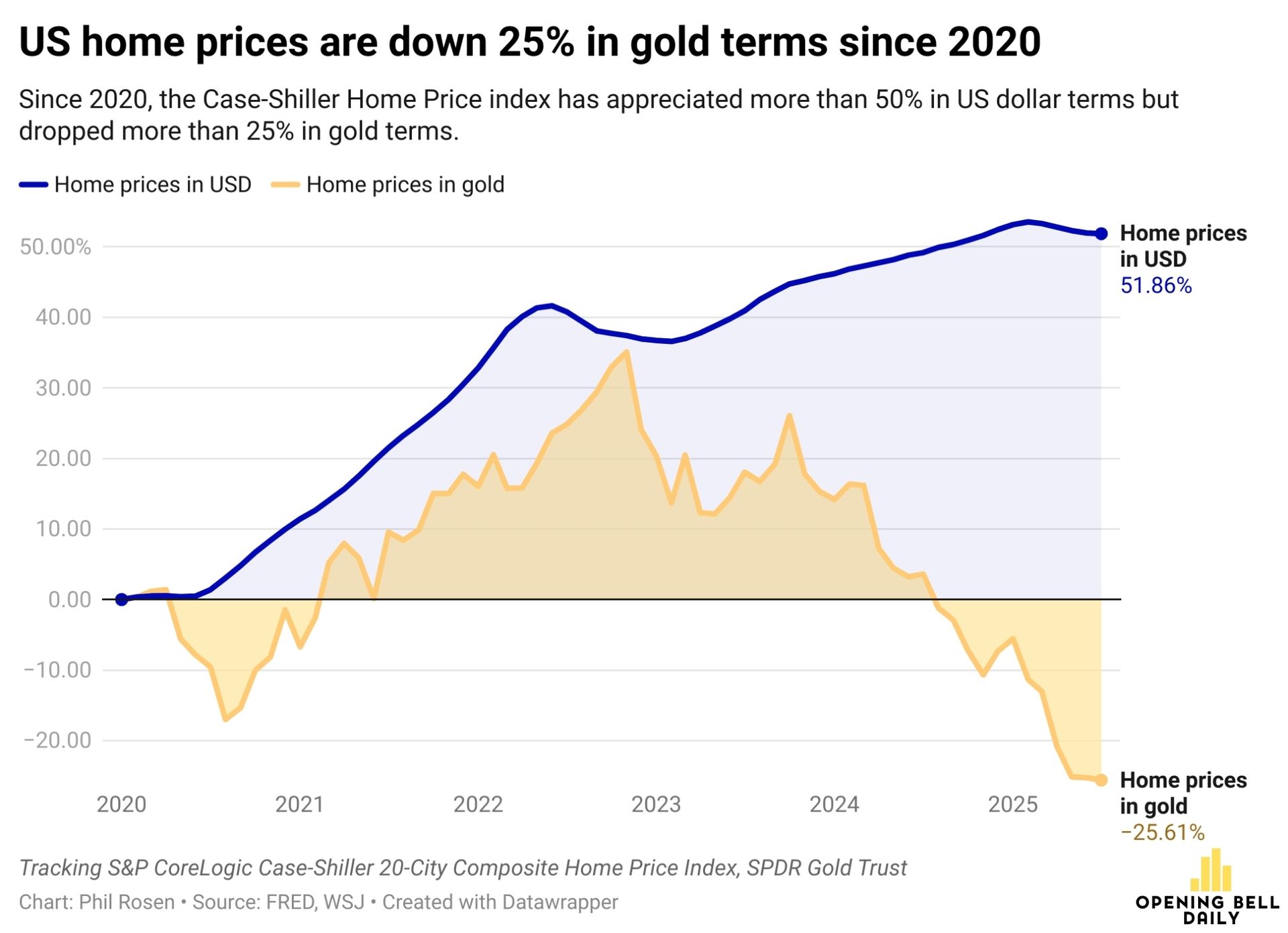 The same pattern holds for home prices denominated in bitcoin and gold.