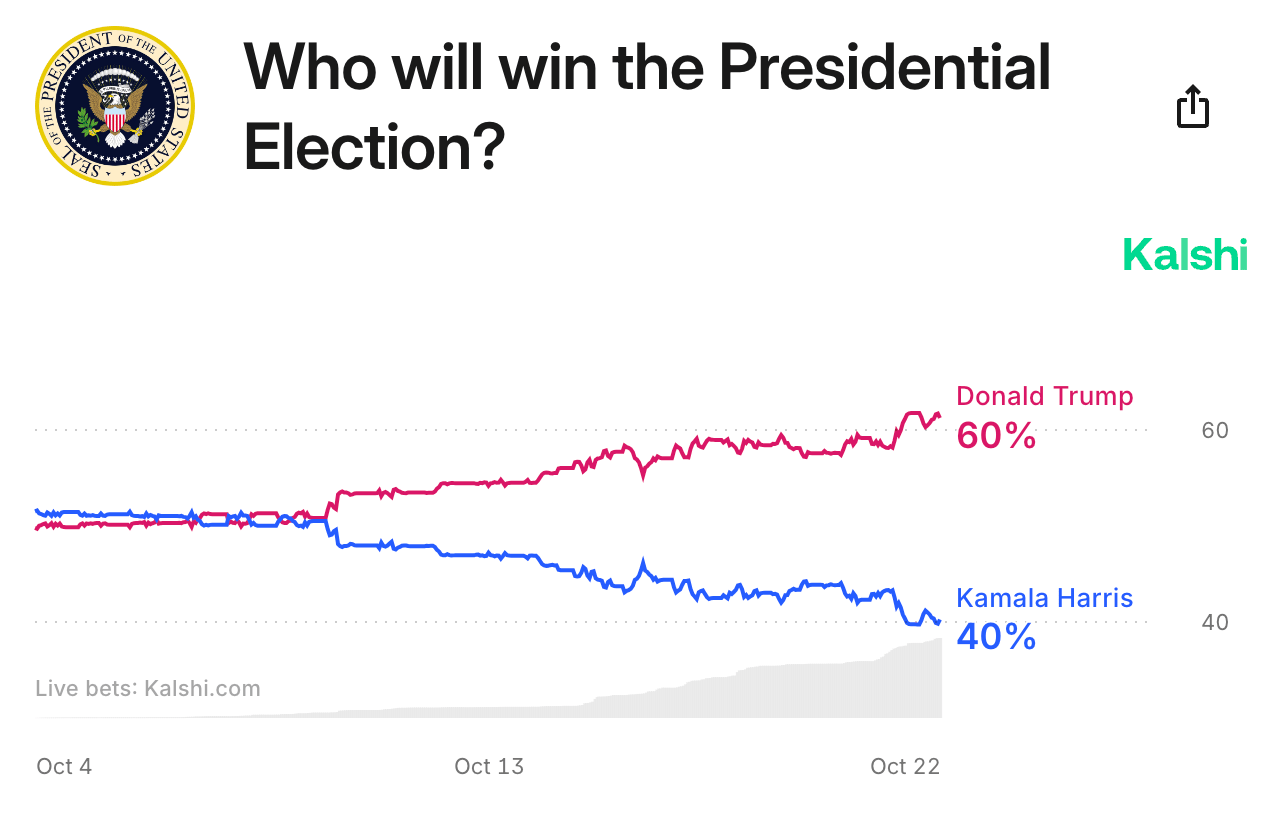 As of Tuesday, Kalshi gives Trump a 60-40 advantage over Kamala Harris.