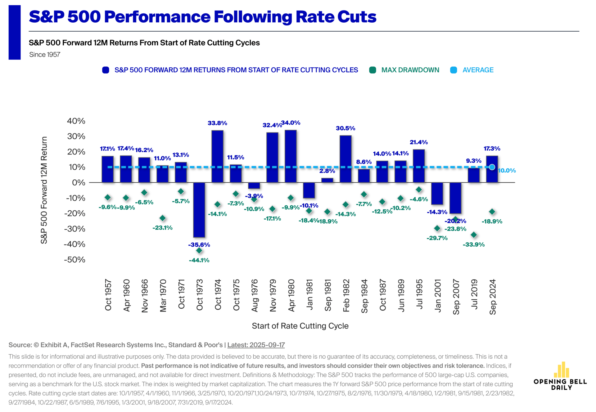 Rate cuts have historically been bullish for stocks (Chart courtesy of Exhibit A)