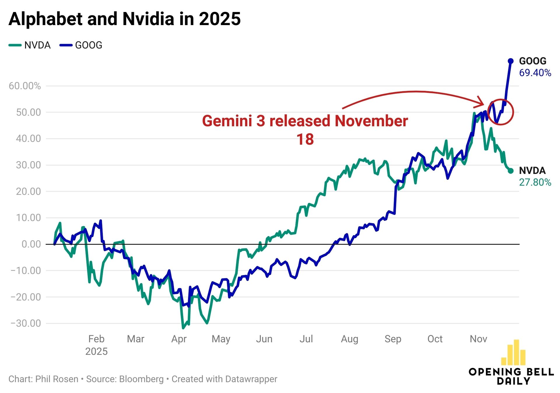 Alphabet’s vertical integration with its new Gemini 3 AI model and its custom AI chips have fueled enthusiasm for its standing in the AI race while spooking Nvidia shareholders, creating a widening performance gap between the two stocks.