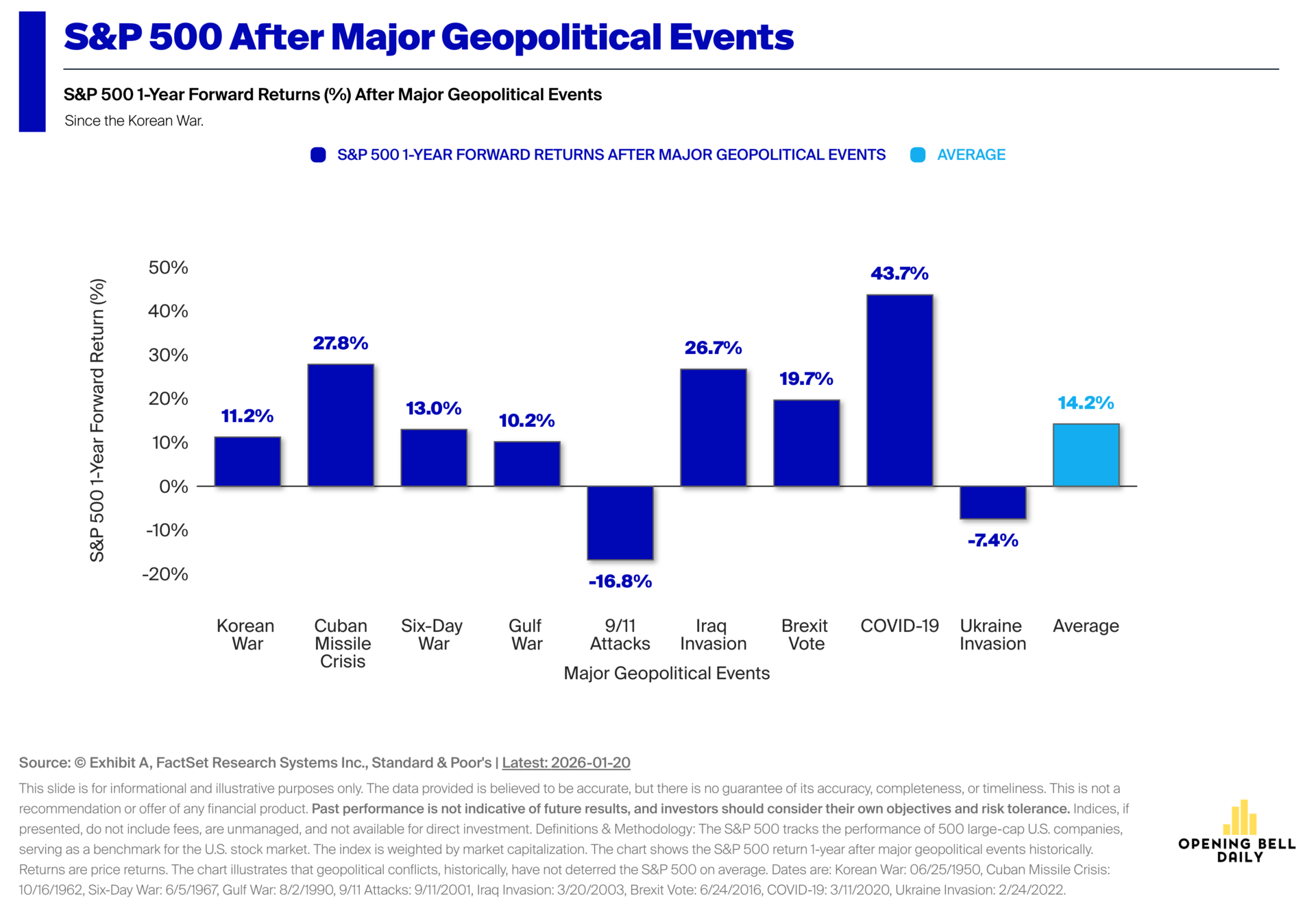 Across the Korean War, Gulf War, 9/11 attacks, Ukraine invasion and other events, the S&P 500 has gained 14.2% on average over the following 12 months.