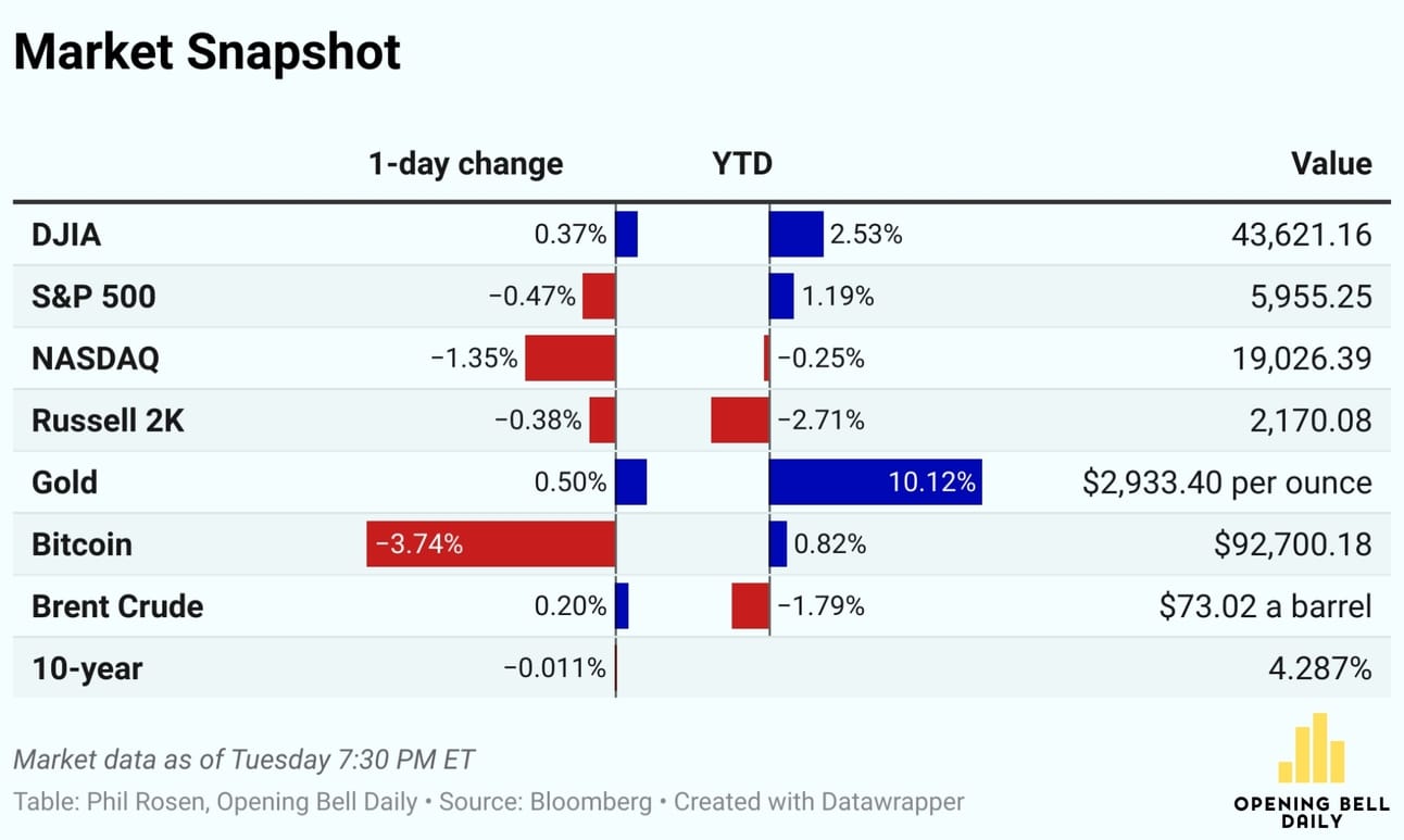 📉 Stocks kept tumbling Tuesday. Tech stocks, crypto, and consumer confidence all dropped, with bitcoin touching $86,000 for the first time since before the November election. The Nasdaq will look to shake its four-day losing streak as Nvidia reports earnings after the bell Wednesday.