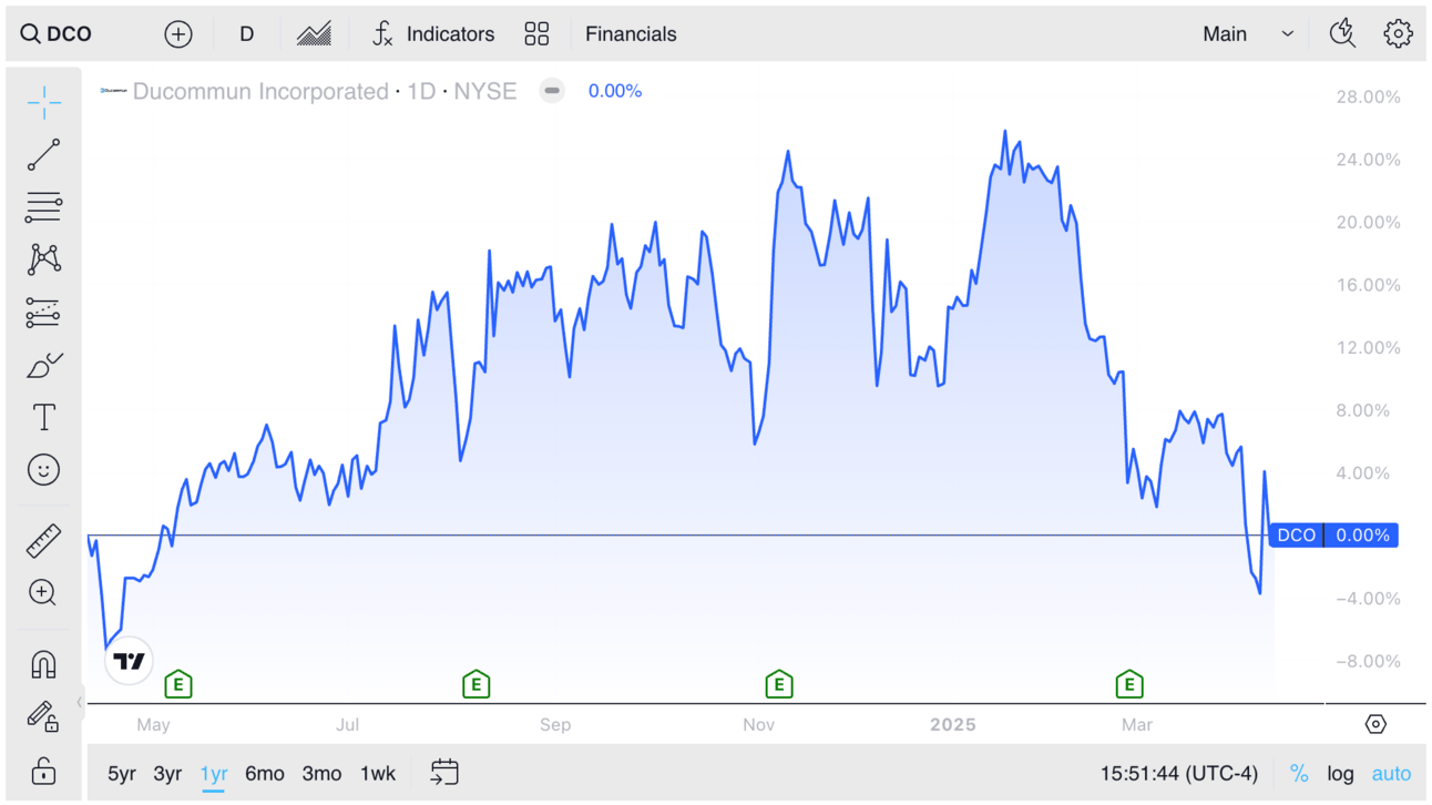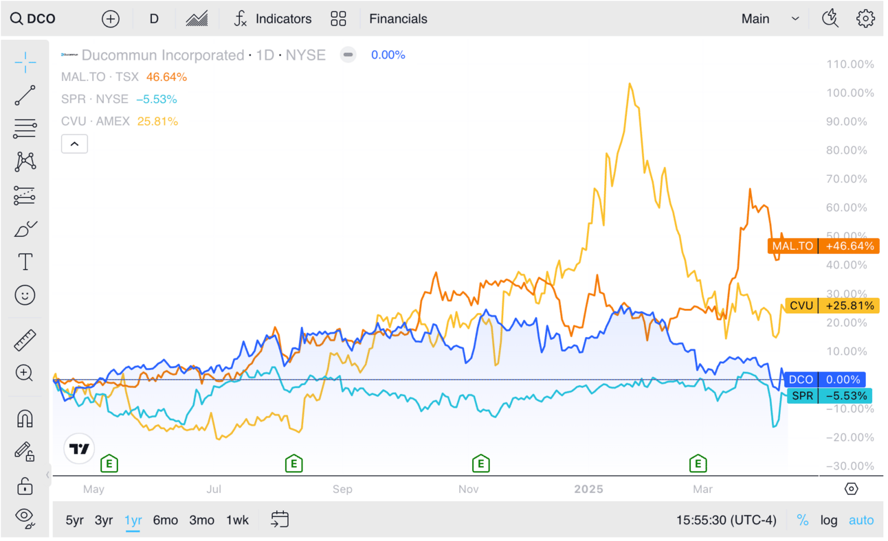 Over the last 12 months, DCO has outpaced its industry competitor Spirit AeroSystems Holdings (-5.53%), while lagging CPI AeroStructures (+25.81%) and Magellan Aerospace (+46.64%).