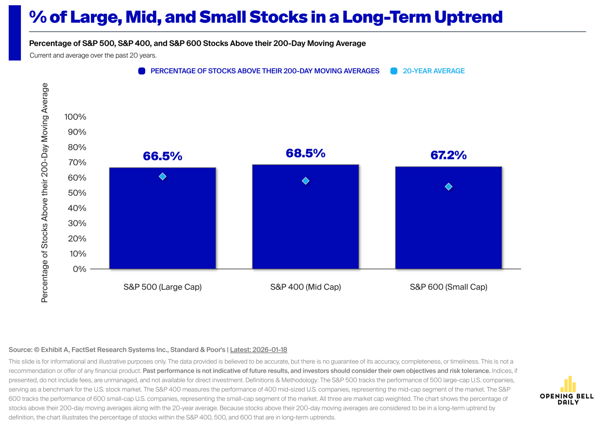 Roughly two-thirds of stocks — small, medium and large — are trading above their 200-day moving averages, with levels well above historical norms.