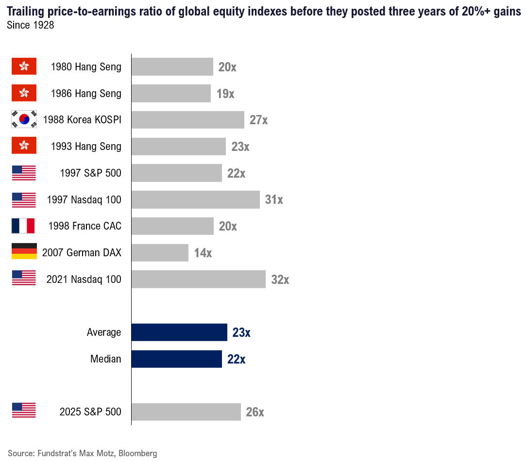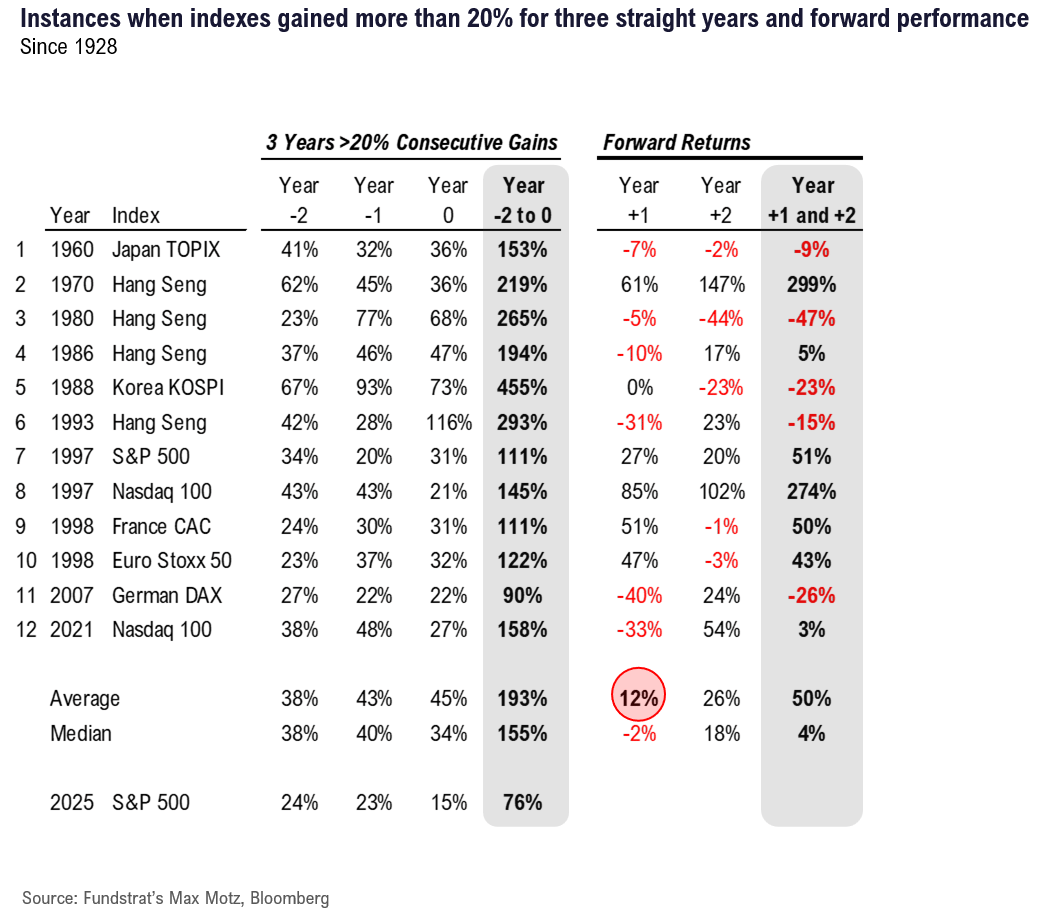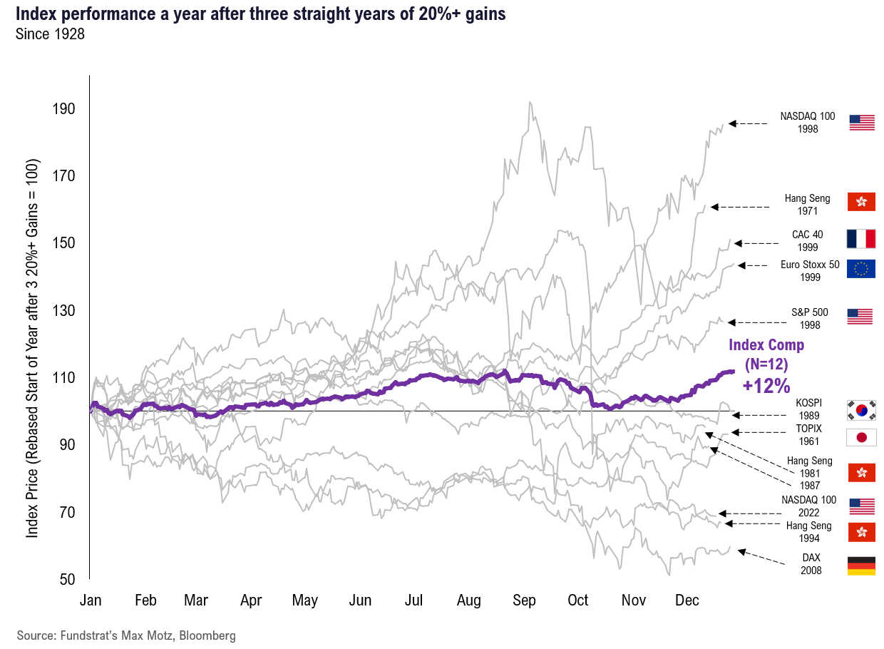 Since 1928, there have been 12 instances of three back-to-back annual advances of at least 20% in global equity markets.