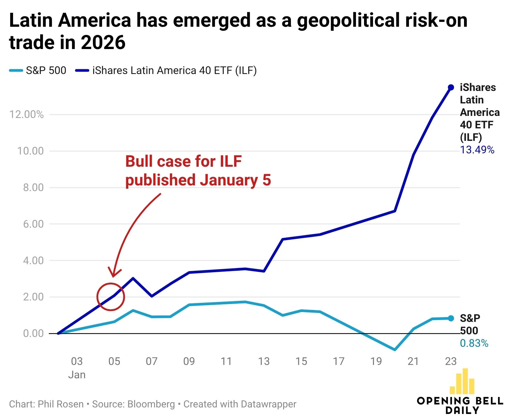 The iShares Latin America 40 ETF (ILF) has climbed more than 13.5% since I first wrote about it on January 5, the first trading day after the capture of Venezuela’s Nicolas Maduro.
