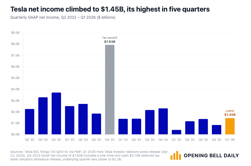 The quarter included one-time warranty and tariff benefits that Tesla disclosed without dollar figures, so the underlying margin lift is real but harder to size than the headline suggests.